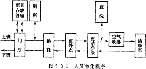 5.3.2 人員凈化用室,應(yīng)根據(jù)換鞋(凈鞋)、更外衣、更潔凈工作服等的需要設(shè)置。雨具存放、廁所、盥洗室、淋浴室、休息室等生活用房和空氣吹淋室、氣閘室、潔凈工作服洗滌間及干燥間等其他用室,可根據(jù)需要設(shè)置。