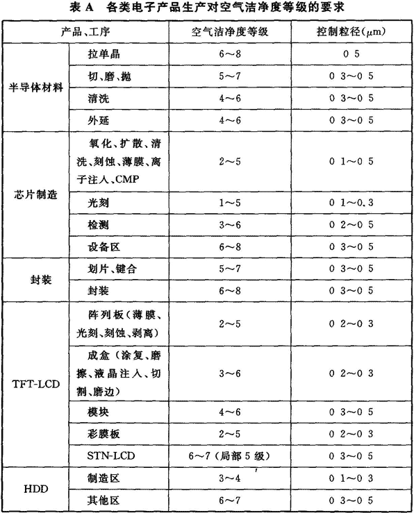 附錄A 各類電子產品生產對空氣潔凈度等級的要求