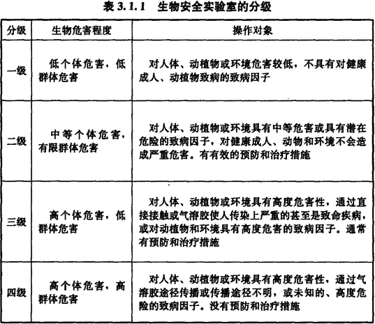 3.1.2 根據(jù)實驗室所處理對象的生物危害程度和采取的防護措施,生物安全實驗室分為四級。微生物生物安全實驗室可采用BSL-1、BSL-2、BSL-3、BSL-4表示相應級別的實驗室;動物生物安全實驗室可采用ABSL-1、ABSL-2、ABSL-3、ABSL-4表示相應級別的實驗室。生物安全實驗室應按表3.1.1進行分級。